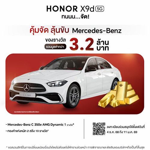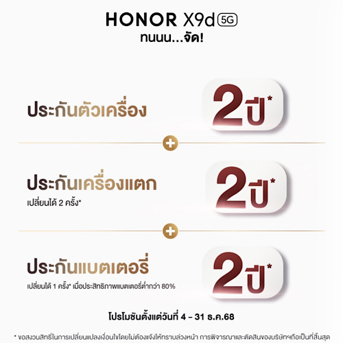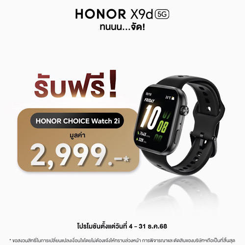 ​HONOR X9d 5G วางจำหน่ายในประเทศไทยกับความจุเดียว 12GB + 256GB พร้อม 3 เฉดสีพรีเมียม ได้แก่ Reddish Brown (สีน้ำตาลแดง), Sunrise Gold (สีทองประกาย) และ Midnight Black (สีดำยามค่ำคืน) ในราคาคุ้มค่า 11,990 บาท มาพร้อมโปรสุดคุ้ม 3 ต่อ โดยต่อที่ 1 รับฟรี! HONOR Choice Watch 2i มูลค่ารวม 2,999 บาท ต่อที่ 2 อุ่นใจด้วยประกันจัดเต็มด้วยประกันศูนย์นาน 2 ปี รับประกันหน้าจอแตก 2 ปี เปลี่ยนเครื่องได้ 2 ครั้ง และประกันแบตเตอรี่ระยะเวลา 2 ปี เปลี่ยนแบตเตอรี่ได้ 1 ครั้ง เมื่อประสิทธิภาพแบตเตอรี่ต่ำกว่า 80% และต่อที่ 3 พิเศษสุด! รับสิทธิ์เป็นผู้โชคดีรับรางวัลใหญ่รถ Mercedes-Benz C 350e AMG Dynamic จำนวน 1 รางวัล หรือ ทองคำหนัก 2 สลึง จำนวน 10 รางวัล โปรโมชั่นและสิทธิ์ลุ้นรางวัลใหญ่ เปิดให้ร่วมตั้งแต่วันที่ 4 ธันวาคม 2568 ถึง 11 มกราคม 2569 ติดตามรายละเอียดเพิ่มเติมและสั่งซื้อได้ที่ Shopee: https://url.in.th/CniYY, Lazada: https://url.in.th/oLgkp, TikTok: https://url.in.th/aAVAJ หรือ HONOR Experience Store ทุกสาขา และร้านค้าตัวแทนจำหน่ายทั่วประเทศ