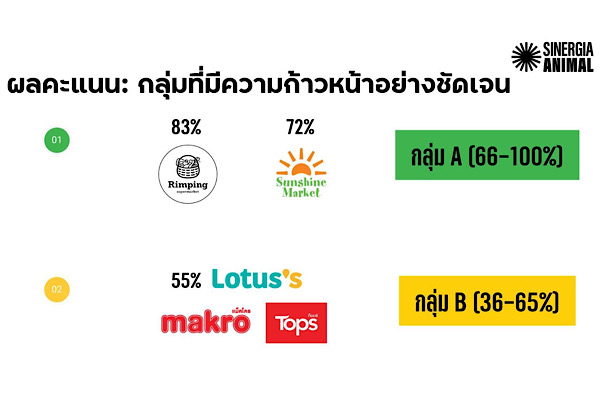 • Sunshine Market – 83% (ระดับ A) มีนโยบายสาธารณะที่แข็งแกร่ง ครอบคลุมทุกแบรนด์และทุกสาขา พร้อมกำหนดช่วงเวลาการเปลี่ยนผ่านที่ชัดเจน