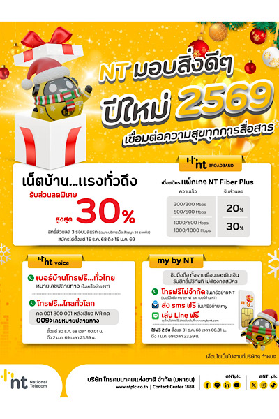 NT เชิญชวนประชาชนและลูกค้าทั่วประเทศร่วมเป็นส่วนหนึ่งของการเฉลิมฉลองปีใหม่ พร้อมรับสิทธิพิเศษก่อนใคร เพื่อเชื่อมต่อทุกความห่วงใยและทุกการสื่อสารได้อย่างเต็มประสิทธิภาพในปี 2569 รายละเอียดเพิ่มเติมที่ www.ntplc.co.th หรือ NT Contact Center 1888