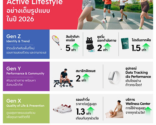 The 1 Insight เผยเทรนด์หลักแห่งปี 2026 Active Lifestyle หรือรูปแบบการใช้ชีวิตที่ให้ความสำคัญกับการเคลื่อนไหวร่างกายเพื่อสุขภาพ หนึ่งใน Big Shift ด้านพฤติกรรมผู้บริโภคระดับโลกปี 2026 สะท้อนผ่านการเติบโตของสินค้าและบริการด้านสุขภาพ กีฬา และการดูแลร่างกายในระยะยาว พร้อมเจาะลึก mindset ของผู้บริโภคในแต่ละช่วงวัย โดยพบว่า Gen Z เน้นหาพื้นที่ใหม่ในการแสดงตัวตนและตามกระแส (Identity & Trend), Gen Y พัฒนาร่างกายและมองหาสังคมแอ็กทีฟ (Performance & Community) ขณะที่ Gen X ให้ความสำคัญกับการดูแลสุขภาพแบบองค์รวมเพื่อคุณภาพชีวิตที่ดี (Quality of Life & Mobility) และ Baby Boomers เน้นดูแลสุขภาพเพื่อช่วงชีวิตที่ยืนยาวและเฝ้าระวังความเสี่ยงทางสุขภาพ (Longevity & Stability)