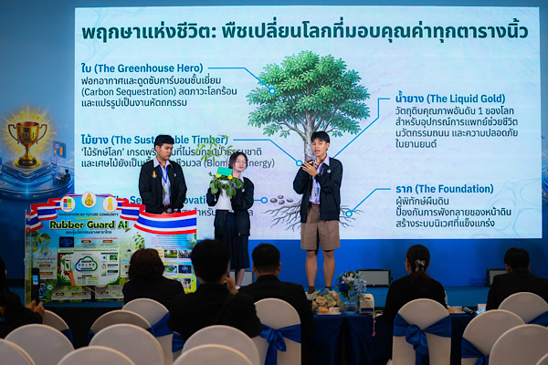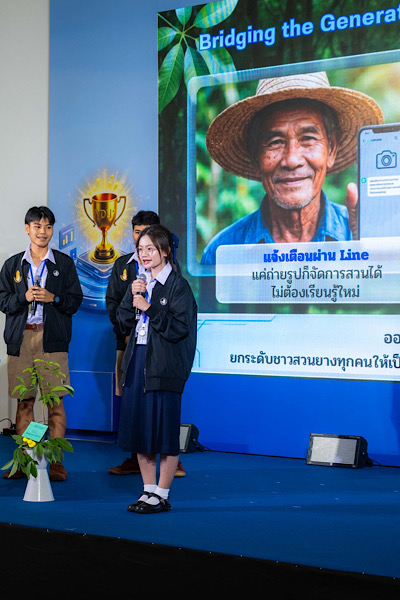 และสำหรับการแข่งขัน AI Hackathon ภายใต้หัวข้อ “My Future Community – ชุมชนแห่งอนาคต” ครั้งนี้ ผู้ชนะเลิศ ที่ได้รับเงินรางวัล 50,000 บาทพร้อมถ้วยรางวัลชนะเลิศ ได้แก่ ทีมตาสระอิสระโอ จาก รร.เบญจมราชูทิศจันทบุรี ภายใต้ผลงาน “RubberGuard AI” คือการสร้าง “My Future Community” สำหรับชาวสวนยางจันทบุรี โดยใช้ AI ช่วยเพิ่มผลผลิต 20-50% ลดสูญเสียจากโรคใบร่วง ลดการจ้างแรงงานแพง และป้องกันการโค่นต้นยาง ผลลัพธ์ที่คาดหวัง คือ ชาวสวนมีรายได้มั่นคงและยั่งยืน ชุมชน กลายเป็น Smart Agri Community ที่ใช้เทคโนโลยีจริง ลดปัญหา แรงงานสูงวัย และรักษาพื้นที่สวนยางให้คงอยู่
