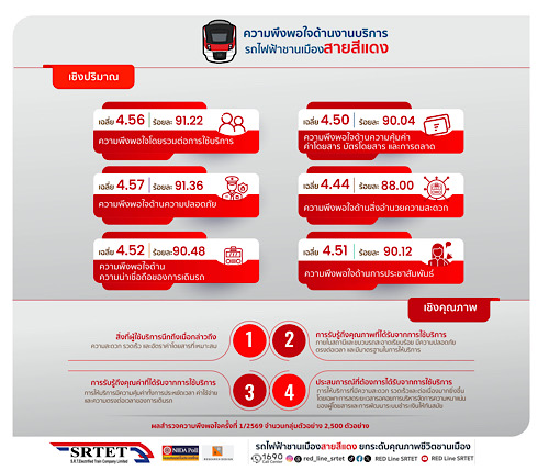 - ด้านความน่าเชื่อถือต่อความตรงต่อเวลา ความถี่ และคุณภาพในการเดินรถไฟฟ้า 4.52 ตอกย้ำความน่าเชื่อถือของระบบรถไฟฟ้าสายสีแดงที่ให้บริการเดินรถตรงตามตารางเวลาอย่างเคร่งครัด